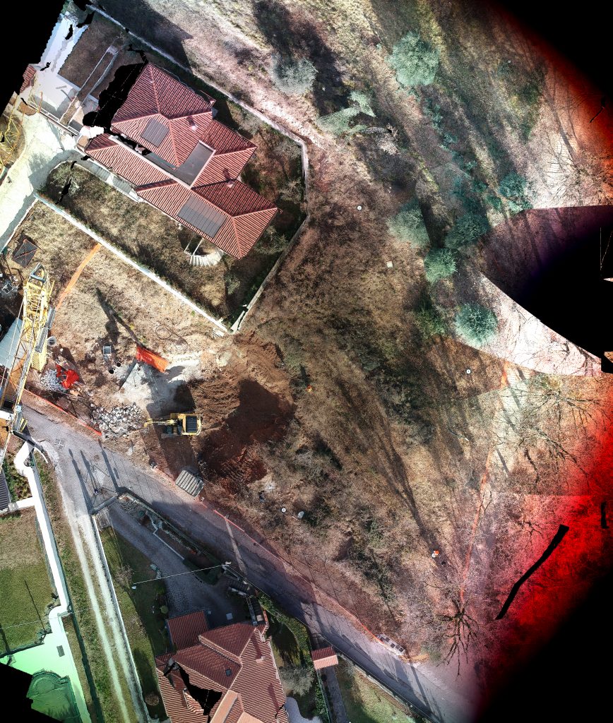 Abbiamo quindi effettuato altri due rilievi in due momenti diversi, con altri due voli in contemporanea per mappare la zona dall’alto. Questa seconda operazione ci ha così consentito di avere sott’occhio tutta la zona di cantiere, consentendoci di evitare possibili errori sulla costruzione del disegno 2D e, nel secondo caso, estrapolare qualche punto che sarebbe stato irraggiungibile fisicamente dall’operatore, in quanto zona molto impervia, se non quasi verticale.